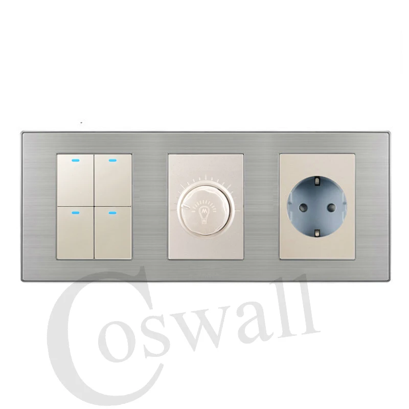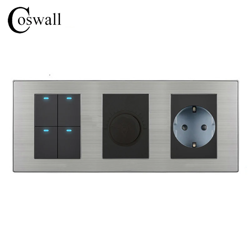 TOP Coswall 4 Gang 2 Way On / Off LED Light Switch + Dimmer With 16A EU Standard Wall Socket Stainless