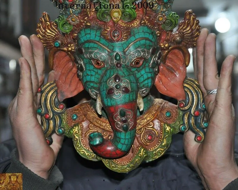 REVIEW TOP SELLER Tibet Bronze Gilt Painted Elephant Jambhala Buddha head mask Wall hanging statue
